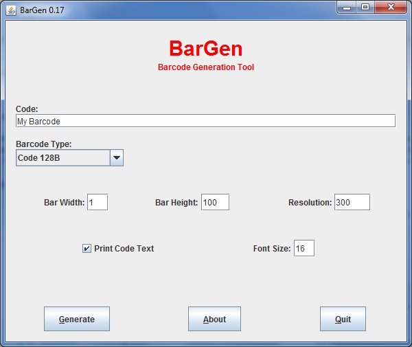 BarGen is a very simple barcode generation tool. BarGen was created in 2004 when I worked on some barcode issues. I needed just a very simple tool to create quickly some barcodes. The generated barcodes can be viewed, printed and saved as image files. BarGen uses external Java classes of the Barbecue project (Many thanks to the people involved!) which provides barcode generation in Java, and that for free. However, so far a simple desktop application built upon these classes was missing. Further information about Barbecue can be found at: http://barbecue.sourceforge.net . Currently, not all features of Barbecue are supported. E.g. there is not yet a support for all barcode type specific settings (e.g. extended Code 39). And it has to be mentioned that both, BarGen and Barbecue are in a beta stadium and may contain some bugs! E.g. PDF417 code may be very experimental so far. Maybe additional features will be added depending on time issues, feedback and further improvements of Barbecue project. |