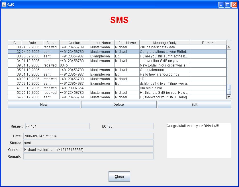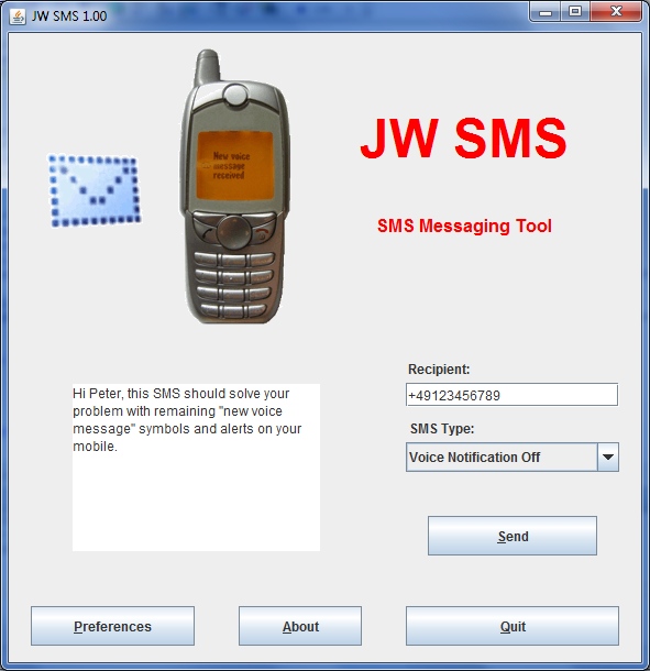 JW SMS is a simple and free Java SMS messaging application. Why another SMS application? Because I needed a tool which is able to send special SMS types like the voice message notification ones. By using such special SMS types it is possible to get rid of certain symbols and alerts on the mobile. These might remain e.g. when a mobile network provider (e.g. a different one of another country) sends a new-voice-message SMS in case a new voice message is left, and afterwards the mailbox is called with a different provider, not sending a second no-new-voice-messages SMS. Although this should be a common problem, I couldn't find any small and free SMS application being able to send these kind of SMS. Only professional and expensive SMS server software with limited testing periods. Usage and distribution of the application itself is free. However, since any SMS is sent through the connected mobile, it will get charged by the provider as if it was sent directly using the phone! Furthermore, it is NOT ALLOWED to use it for teasing others and any user is responsible by themself for things done with this application! Sorry, but please note as well that installation might require some manual work and a certain system knowledge/experience. Update: On most of the recent mobiles (e.g. Android devices) there is meanwhile a built-in functionality to delete such notification symbols. In this case it is not necessary anymore to make use of this tool. |