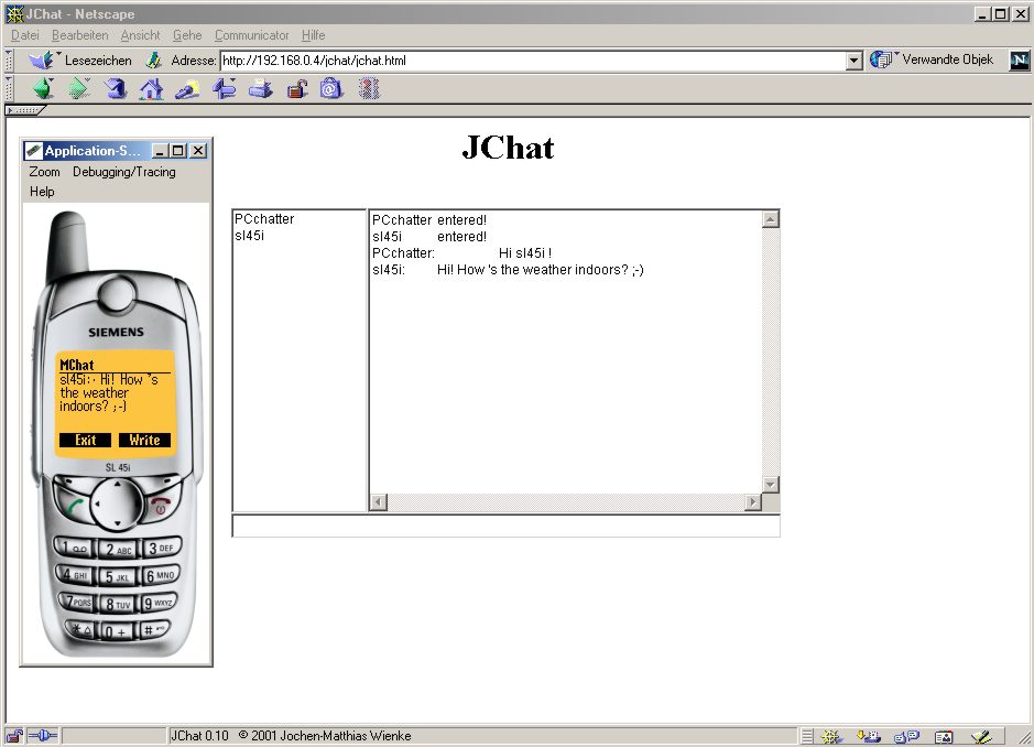 An internet and Java MIDlet capable device (e.g. Siemens SL45i, Nokia N95, ...) is required. Update: Unfortunately, meanwhile the original Java applet approach is resigned. And given the necessary steps for an user to get such an applet running (comprehensive security settings which might even endanger the system if not done properly) it is not reasonable anymore to continue this project. With missing support for the original Java midlets on most of the recent mobile devices this is true as well for the MChat client. |